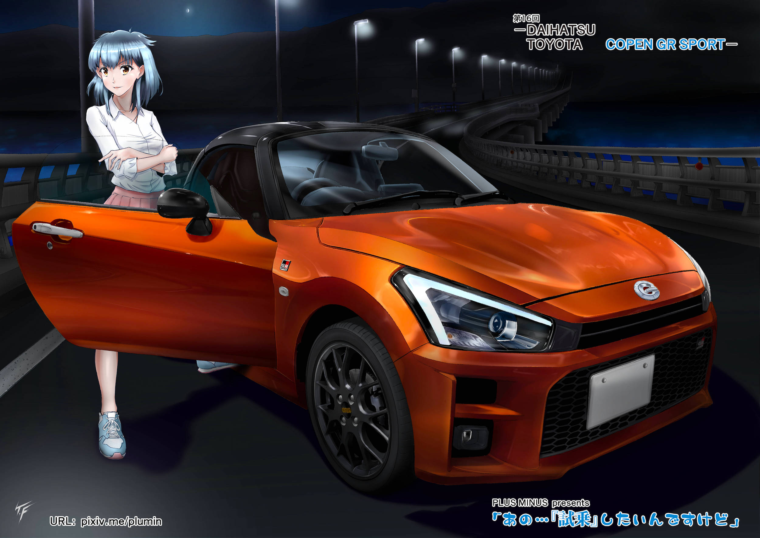 1girl artist_name blue_hair blue_shoes blush brown_eyes car collared_shirt crossed_arms daihatsu_copen highres license_plate looking_at_viewer medium_hair motor_vehicle night open_mouth original outdoors pink_skirt plus_minus_(plumin) road shirt shirt_tucked_in shoes skirt sneakers solo sports_car translation_request v-shaped_eyebrows vehicle_focus vehicle_name watermark web_address white_shirt