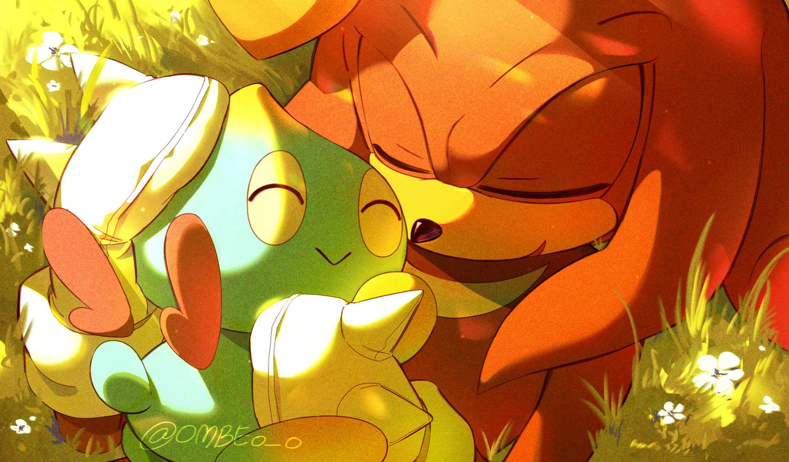 1boy 1other animal_nose artist_name blue_skin chao_(sonic) cheese_(sonic) closed_eyes closed_mouth colored_skin commentary flower furry furry_male gloves grass hand_on_another's_head hands_up highres hug knuckles_the_echidna lying mini_wings multicolored_skin neutral_chao ombeo_o on_back open_mouth outdoors red_fur smile sonic_(series) spiked_gloves sunlight untranslatable_commentary white_flower white_gloves wings yellow_skin