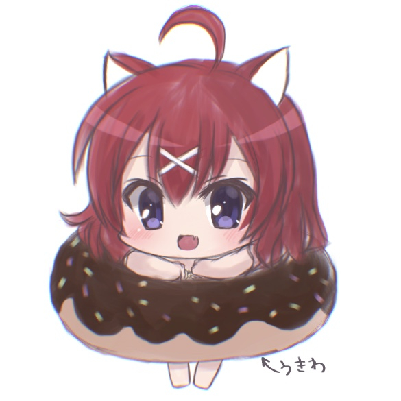 1girl :d ahoge amairo_islenauts animal_ears blue_eyes blush chibi commentary donut_innertube fang hair_between_eyes hair_ornament hands_up happy innertube looking_at_viewer mahigu_re masaki_gaillard medium_hair open_mouth red_hair simple_background skin_fang smile solo standing swim_ring translated white_background wolf_ears wolf_girl x_hair_ornament