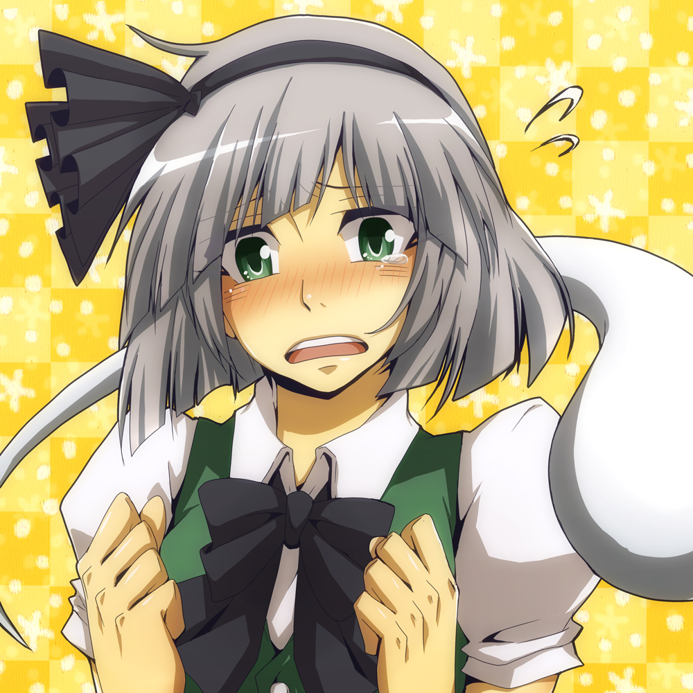 1girl black_bow black_bowtie black_hairband blush bow bow_hairband bowtie checkered_background collared_shirt commentary_request embarrassed flying_sweatdrops furrowed_brow green_eyes green_vest grey_hair hairband hands_up konpaku_youmu konpaku_youmu_(ghost) medium_hair nitoni open_mouth puffy_sleeves shirt short_sleeves solo tears teeth touhou upper_body upper_teeth_only vest white_shirt yellow_background