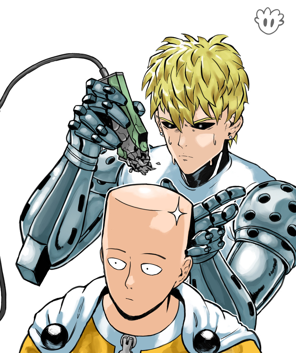 2boys bald blonde_hair cutting_hair genos hair_clipper multiple_boys one-punch_man saitama_(one-punch_man) short_hair sweat white_background
