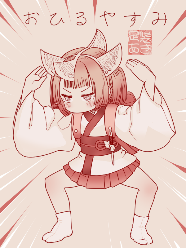 1girl artist_logo backpack bag blush commentary crime_prevention_buzzer emphasis_lines f_tabiaki hands_up headgear japanese_clothes jitome kimono legs_apart logo long_sleeves monochrome no_mouth no_shoes obi obijime pleated_skirt randoseru red_theme sash short_kimono short_twintails simple_background skirt solo squatting tabi touhoku_kiritan translation_request twintails v-shaped_eyebrows voiceroid wide_sleeves