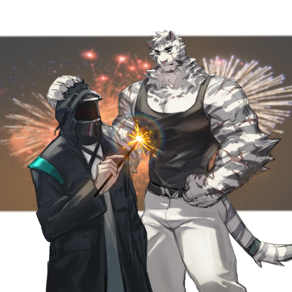 1boy 1other animal_ears arknights bara biceps black_tank_top chinese_commentary claws clenched_hand cloak commentary_request cross_scar doctor_(arknights) facial_scar feet_out_of_frame fireworks furry furry_male hand_on_another's_head holding holding_fireworks hood hooded_cloak hujusheng infection_monitor_(arknights) looking_at_another male_focus mountain_(arknights) multiple_scars muscular muscular_male pants pectorals scar scar_across_eye scar_on_arm scar_on_cheek scar_on_face scar_on_shoulder shirt sleeveless sleeveless_shirt sparkler tail tank_top tiger_boy tiger_ears tiger_stripes tiger_tail white_pants