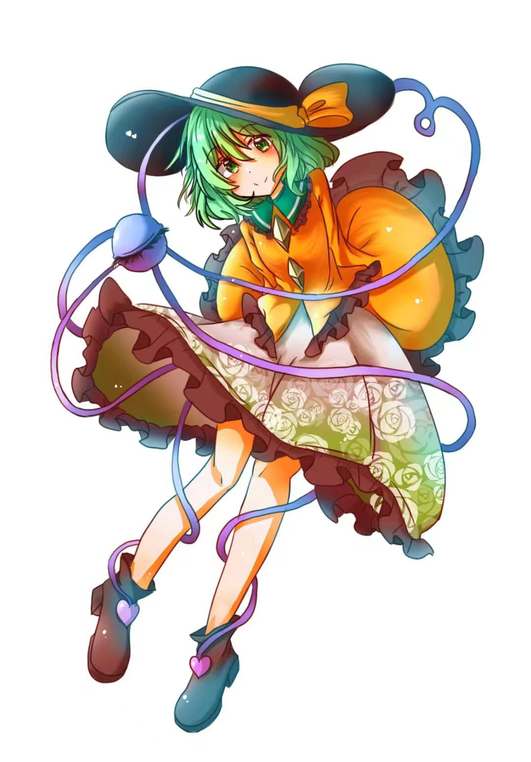 1girl black_hat black_shoes buttons chinese_commentary closed_mouth commentary_request diamond_button flat_chest floral_print frilled_shirt frilled_shirt_collar frilled_skirt frilled_sleeves frills full_body green_eyes green_hair green_skirt hat hat_ribbon heart highres komeiji_koishi long_sleeves mahoushaojiulilika05836 medium_hair ribbon shirt shoes simple_background skirt smile solo third_eye touhou white_background wide_sleeves yellow_shirt
