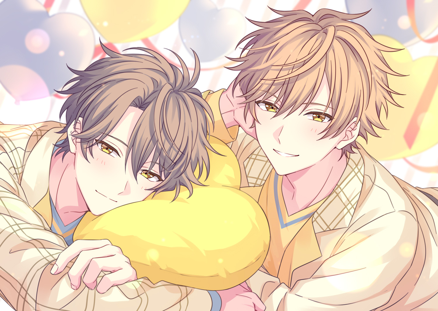 2boys arm_support balloon blue_shirt blush brothers brown_hair brown_jacket closed_mouth commentary_request heart heart-shaped_pillow heart_balloon hugging_object jacket kisaki_chihiro kisaki_hotaru long_sleeves looking_at_viewer lying multiple_boys on_air! on_stomach pillow pillow_hug sekina shirt siblings smile twins upper_body yellow_eyes yellow_shirt