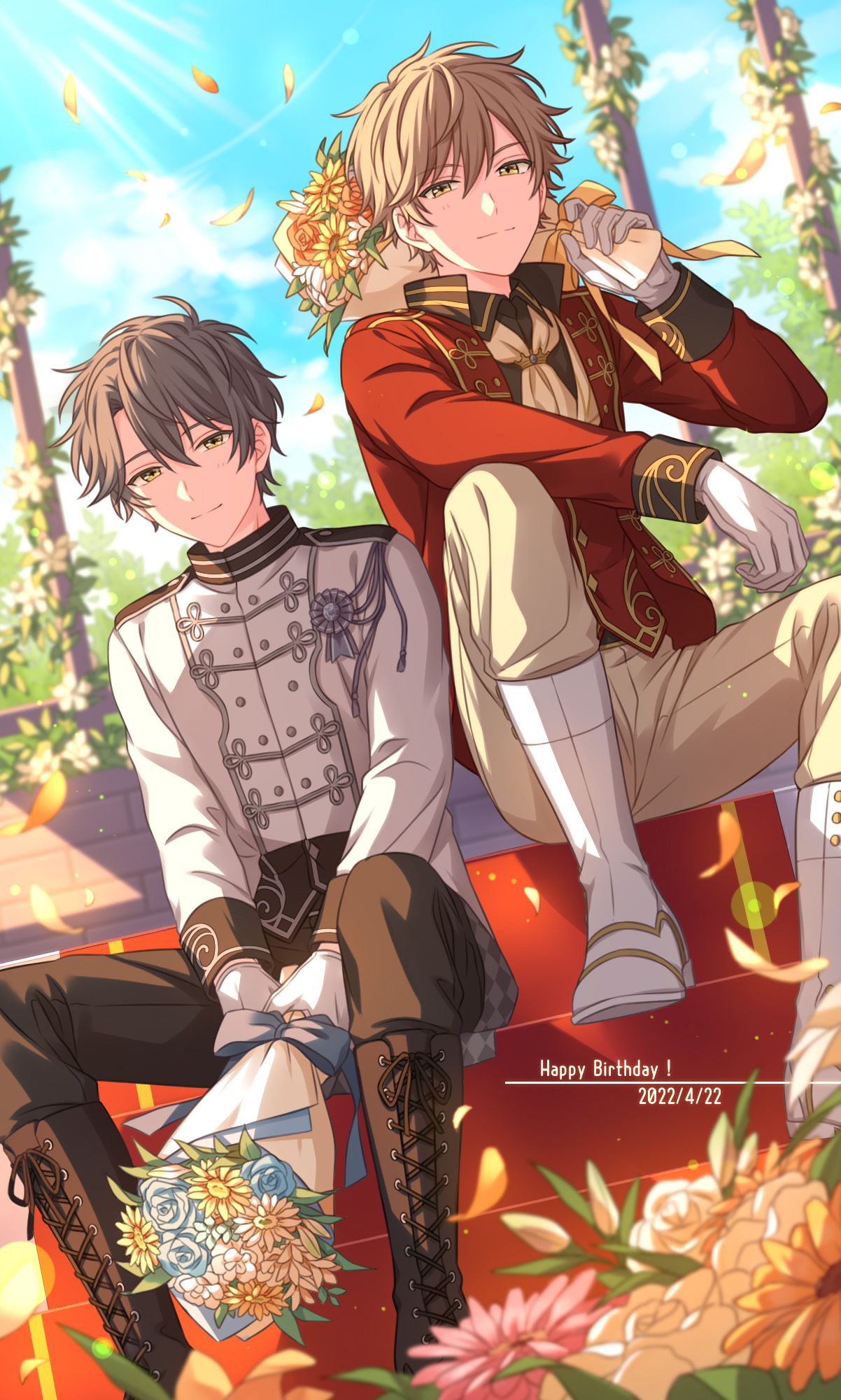 2boys ascot blue_flower blue_sky boots bouquet brick_wall brothers brown_eyes brown_footwear brown_hair brown_pants commentary_request dated flower full_body gloves happy_birthday highres holding holding_bouquet kisaki_chihiro kisaki_hotaru knees_up long_sleeves male_focus multiple_boys on_air! outdoors pants petals pink_flower red_shirt sekina shirt siblings sitting sky smile spread_legs thigh_boots twins white_flower white_footwear white_gloves white_shirt yellow_ascot yellow_flower yellow_pants