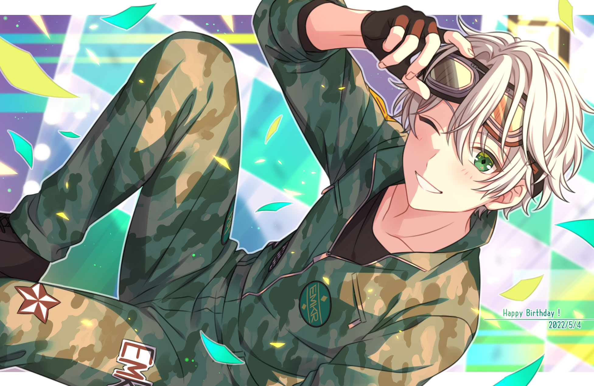 1boy adjusting_eyewear black_footwear black_gloves black_shirt camouflage commentary_request dated feet_out_of_frame fingerless_gloves gloves goggles goggles_on_head green_background green_eyes green_jumpsuit happy_birthday highres hinase_midori jumpsuit knee_up letterboxed male_focus multicolored_background on_air! sekina shirt short_hair solo white_hair