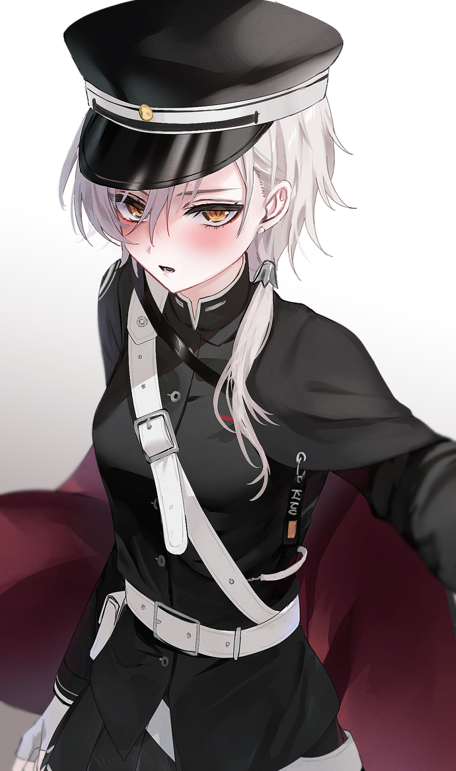 1girl azur_lane belt blush cape fingerless_gloves gloves hair_ornament hair_over_shoulder half-closed_eyes hat highres kinu_(azur_lane) long_hair looking_at_viewer military_hat military_uniform open_mouth ponytail skirt solo trtrpnk white_hair yellow_eyes