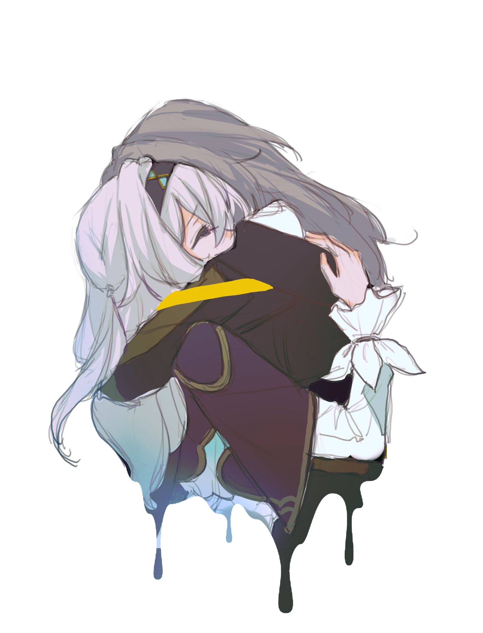 0214x0826 2girls black_hairband black_jacket closed_eyes cropped_torso facing_another firefly_(honkai:_star_rail) from_side grey_hair hair_between_eyes hair_intakes hairband highres honkai:_star_rail honkai_(series) hood hood_down hooded_jacket hug jacket long_hair long_sleeves melting multiple_girls profile shirt sidelocks simple_background stelle_(honkai:_star_rail) trailblazer_(honkai:_star_rail) white_background white_hair white_shirt yuri