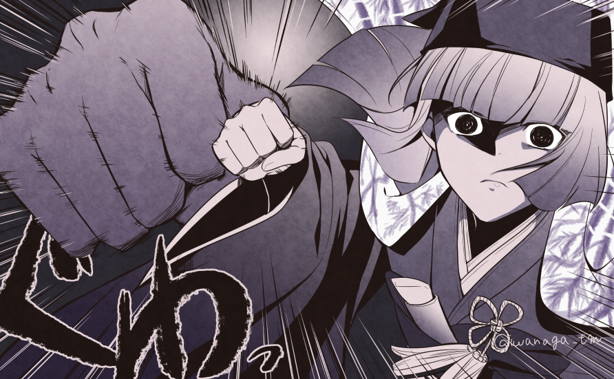 1girl chajinbou closed_mouth fate/grand_order fate_(series) ghost_hands giant_hand impending_doom incoming_attack incoming_punch iwanaga_tm japanese_clothes kimono looking_at_viewer monochrome motion_lines punching sen_no_rikyu_(fate) sen_no_rikyu_(second_ascension)_(fate) short_hair solo speed_lines twitter_username upper_body wind