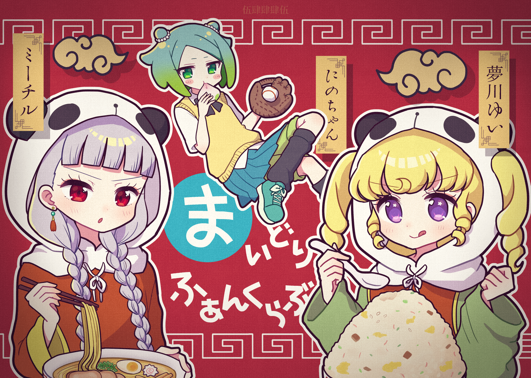 3girls animal_hood baseball baseball_glove blonde_hair blue_skirt blunt_bangs blush bowl braid character_name chinese_clothes chopsticks closed_mouth cloud commentary_request earrings eating food fried_rice full_body green_eyes green_hair grey_hair hand_up hands_up highres holding holding_chopsticks holding_spoon hood hood_up idol_time_pripara jewelry koda_michiru koyoshi_yoko leg_warmers long_hair long_sleeves looking_at_viewer meandros miichiru_(pripara) multiple_girls nijiiro_nino noodles open_mouth outline panda_hood pleated_skirt pretty_series pripara purple_eyes ramen red_background red_eyes ringlets shirt shoes short_hair skirt smile sneakers spoon sweater_vest tongue tongue_out translation_request twin_braids two_side_up upper_body very_long_hair white_outline white_shirt xiangyun yellow_sweater_vest yumekawa_yui