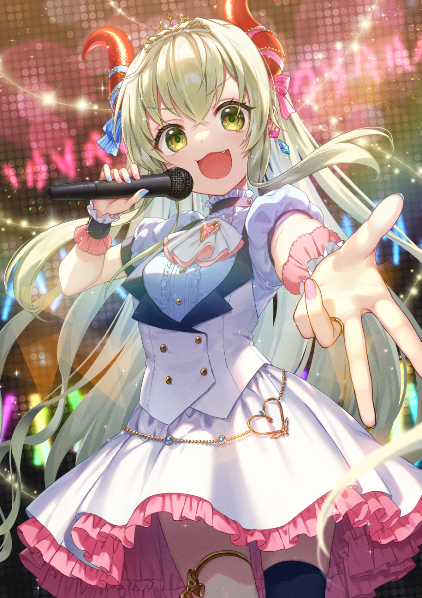 1girl :d ascot black_thighhighs blue_bow bow brown_eyes center_frills commentary_request copyright_request fang frilled_skirt frills hair_bow heart highres holding holding_microphone horns kayase light_brown_hair long_hair microphone open_mouth outstretched_arm pink_bow puffy_short_sleeves puffy_sleeves shirt short_sleeves single_thighhigh skirt smile solo striped_bow thighhighs tiara very_long_hair vest virtual_youtuber white_ascot white_shirt white_skirt white_vest wrist_cuffs