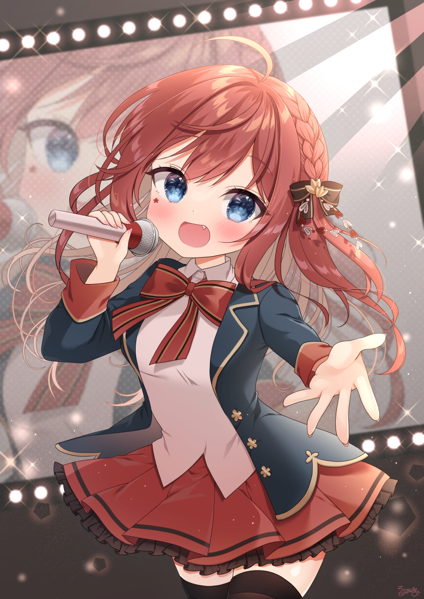 1girl ahoge black_bow black_thighhighs blue_eyes blue_jacket bow braid commission fang frilled_skirt frills hair_bow hanasaki_kureha highres holding holding_microphone idol indie_virtual_youtuber jacket light long_hair microphone nanase_(ribonshitoron) open_mouth red_bow red_hair red_skirt shirt side_braid skeb_commission skirt thighhighs virtual_youtuber white_shirt