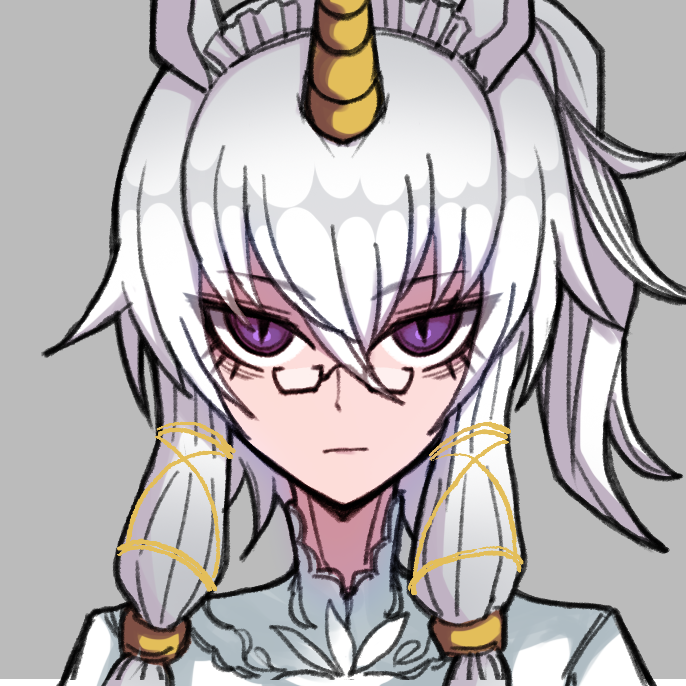 1girl animal_ears black_souls black_souls_2 closed_mouth commentary eyelashes glasses grey_background hair_between_eyes horns horse_ears horse_girl koshou_shou_mitsu long_hair ponytail portrait purple_eyes single_horn solo straight-on untranslatable_commentary tsurime unicorn_girl unis_(black_souls) upper_body white_hair yellow_horns