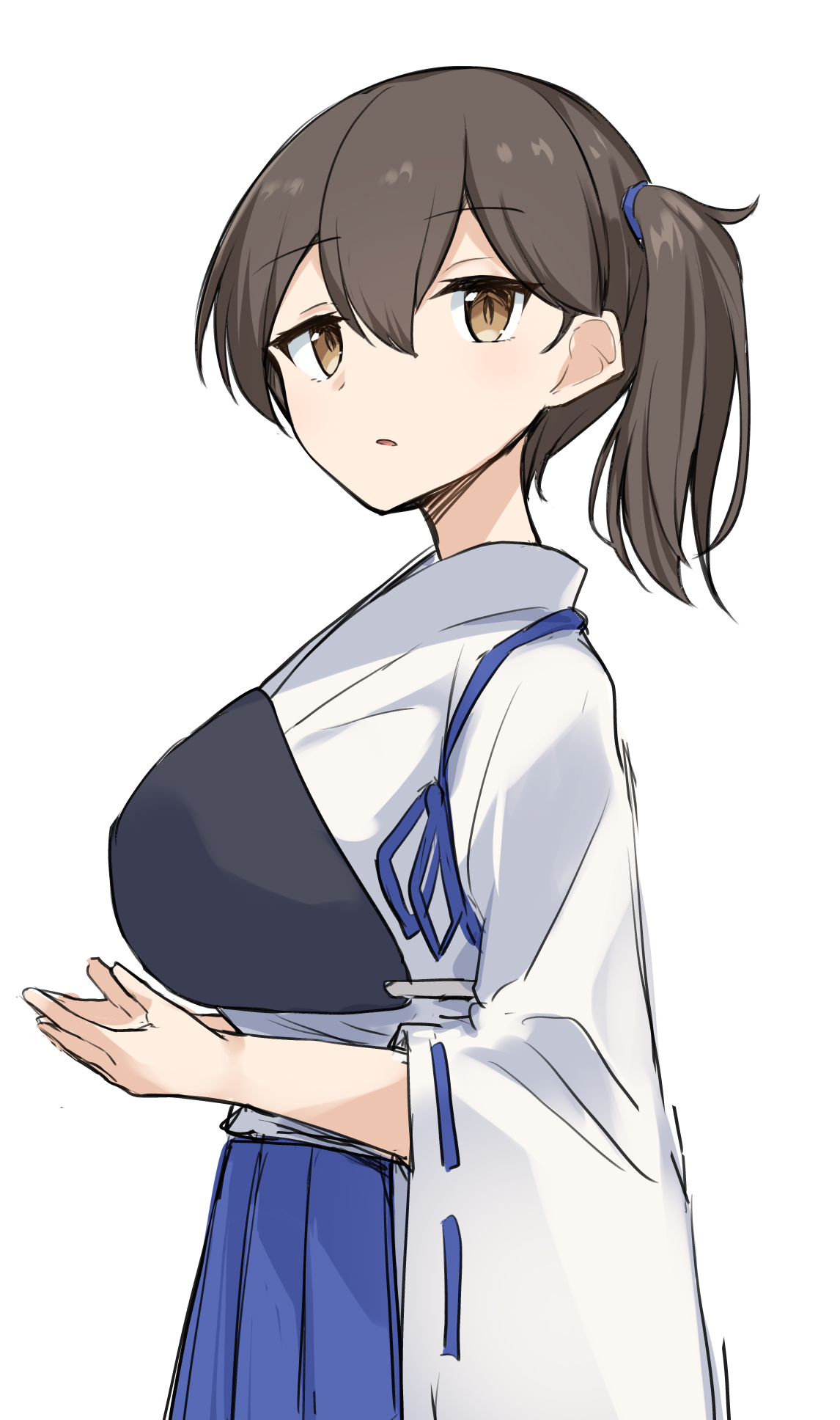 1girl black_hair blue_hakama brown_eyes hakama hakama_skirt highres japanese_clothes kaga_(kancolle) kantai_collection looking_at_viewer medium_hair muneate one-hour_drawing_challenge ribbon-trimmed_sleeves ribbon_trim sakikumo_(sakumo) side_ponytail skirt solo tasuki wide_sleeves
