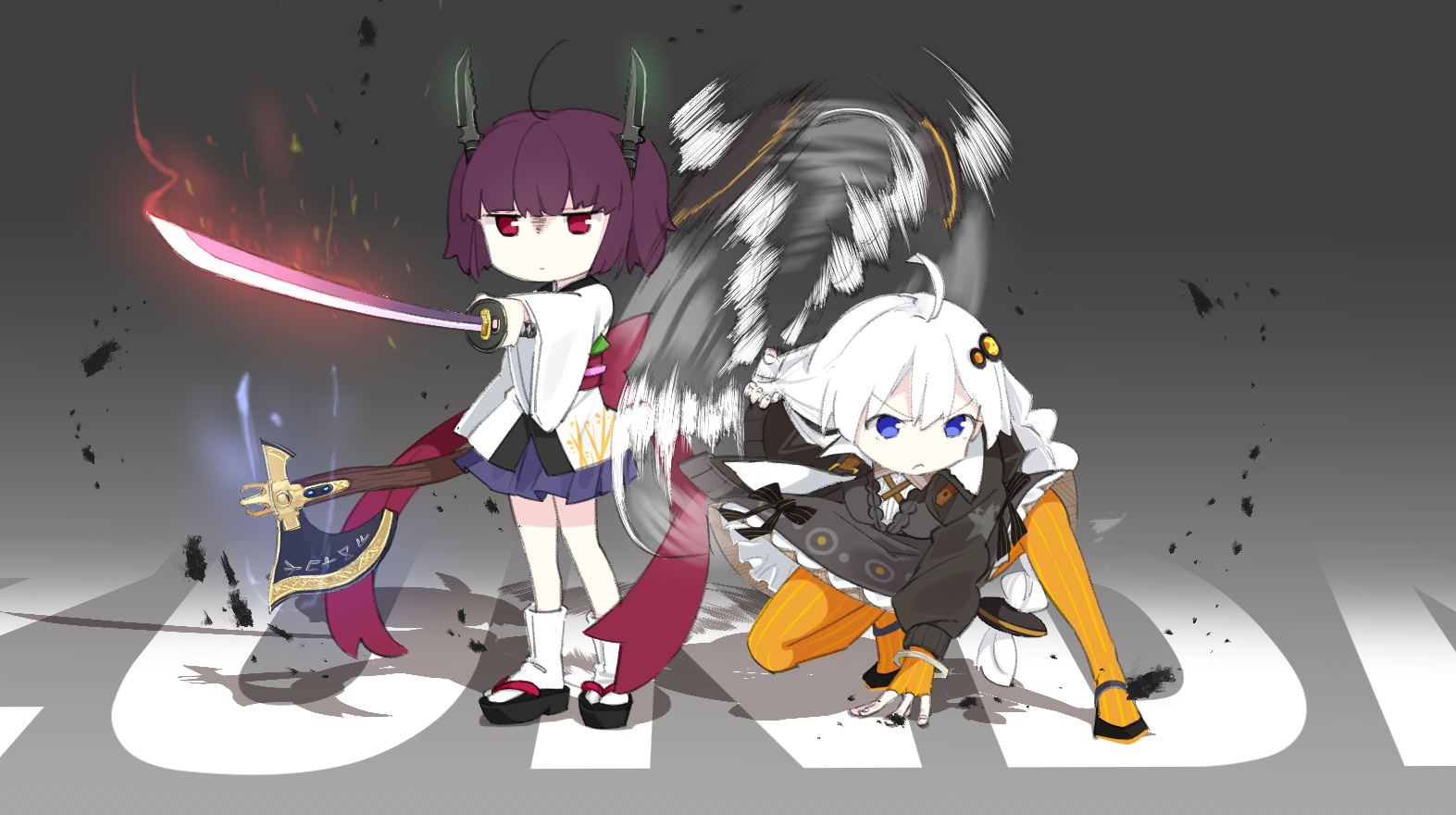 2girls afterimage ahoge arm_support aura axe black_dress black_jacket blue_eyes blue_skirt bracelet braid closed_mouth collared_shirt combat_knife cross_tie dress fingerless_gloves frown fur-trimmed_jacket fur_trim glaring gloves glowing glowing_weapon gradient_background grey_background hair_ornament hair_weapon holding holding_axe holding_own_hair holding_sword holding_weapon jacket japanese_clothes jewelry jitome katana kimono kizuna_akari knife knife_hair_ornament konori_(ahurerukuiizi) looking_ahead low_twin_braids motion_blur multiple_girls okobo open_clothes open_jacket orange_gloves orange_pantyhose outstretched_arm pantyhose platform_sandals pleated_skirt purple_hair red_eyes sandals shirt short_twintails skirt socks spinning squatting standing sword tabi touhoku_kiritan twin_braids twintails v-shaped_eyebrows vocaloid voiceroid weapon white_hair white_kimono white_socks wide_sleeves