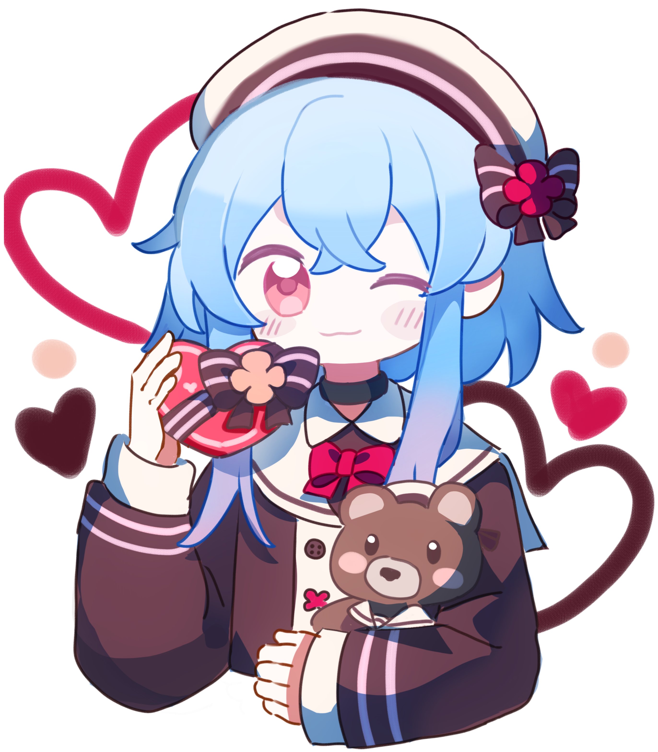 1boy absurdres akaruku alternate_costume alternate_hairstyle arknights blue_hair blush bow bowtie brown_shirt buttons commentary cropped_torso english_commentary gradient_hair heart highres holding holding_heart holding_stuffed_toy looking_at_viewer male_focus mizuki_(arknights) multicolored_hair one_eye_closed pink_eyes purple_hair red_bow red_bowtie sailor_collar shirt short_hair_with_long_locks simple_background smile solo stuffed_animal stuffed_toy teddy_bear white_background white_headwear white_sailor_collar