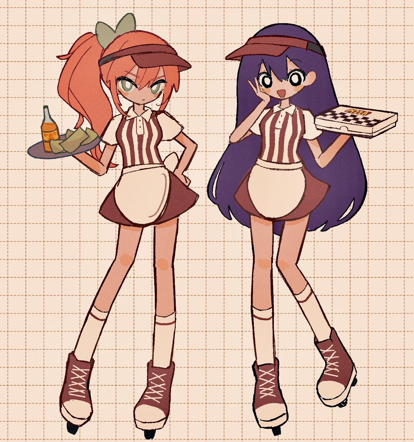 2girls alternate_costume alternate_hair_color alternate_hairstyle annoyed apron aqua_bow aqua_eyes aubrey_(faraway)_(omori) aubrey_(omori) black_eyes bow bright_pupils closed_mouth collared_shirt cup drinking_glass food glass hair_between_eyes hair_bow hand_on_own_face hand_on_own_hip highres holding holding_tray long_hair looking_at_viewer mari_(faraway)_(omori) mari_(omori) money multiple_girls omori open_mouth pink_hair pizza_box ponytail purple_hair red_footwear red_shirt red_skirt red_visor roller_skates shirt shoelaces short_sleeves skates skirt smile socks striped_clothes striped_shirt tray user_yprm7442 vertical-striped_clothes vertical-striped_shirt visor_cap white_apron white_pupils white_shirt white_sleeves white_socks
