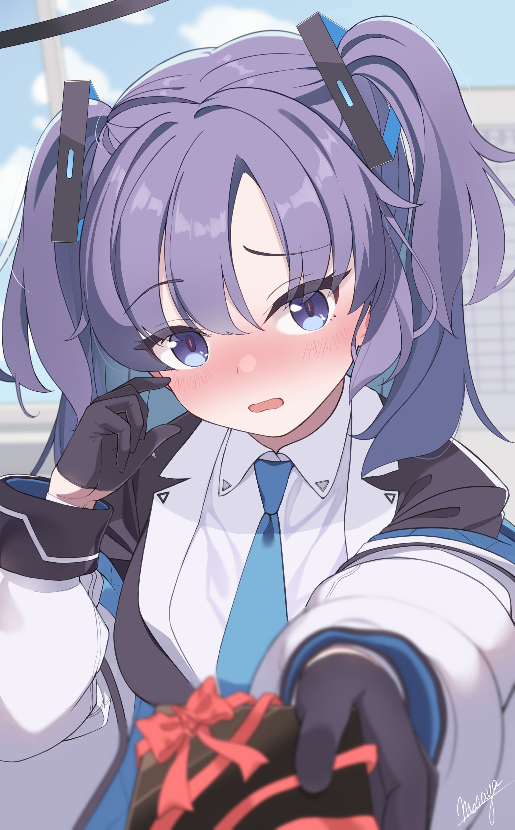 1girl absurdres black_gloves black_jacket blue_archive blush box collared_shirt commentary_request gloves highres holding holding_box jacket long_hair looking_at_viewer masaya_(masapari88) open_mouth partial_commentary purple_eyes purple_hair shirt solo two_side_up white_shirt yuuka_(blue_archive)