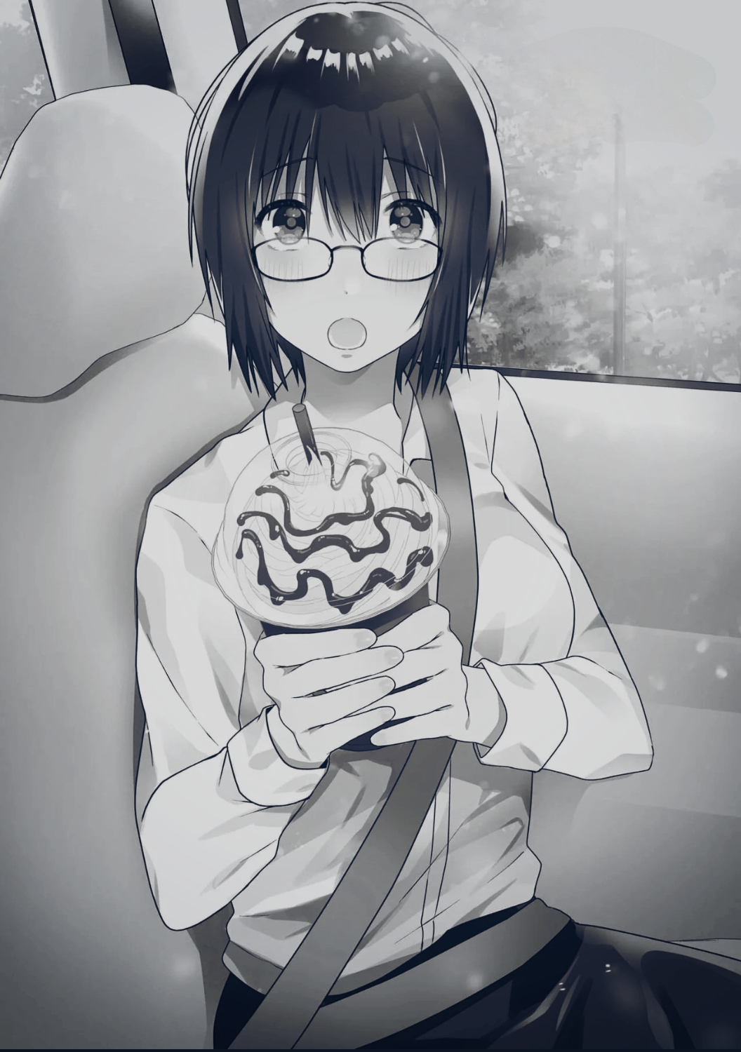 1girl black_skirt brown_eyes brown_hair glasses grey_hair highres kouhai_ol_wa_maid_no_hina-san_nanka_ja_nai long_hair looking_at_viewer open_mouth sitting skirt vehicle_interior white_background window yano_akari