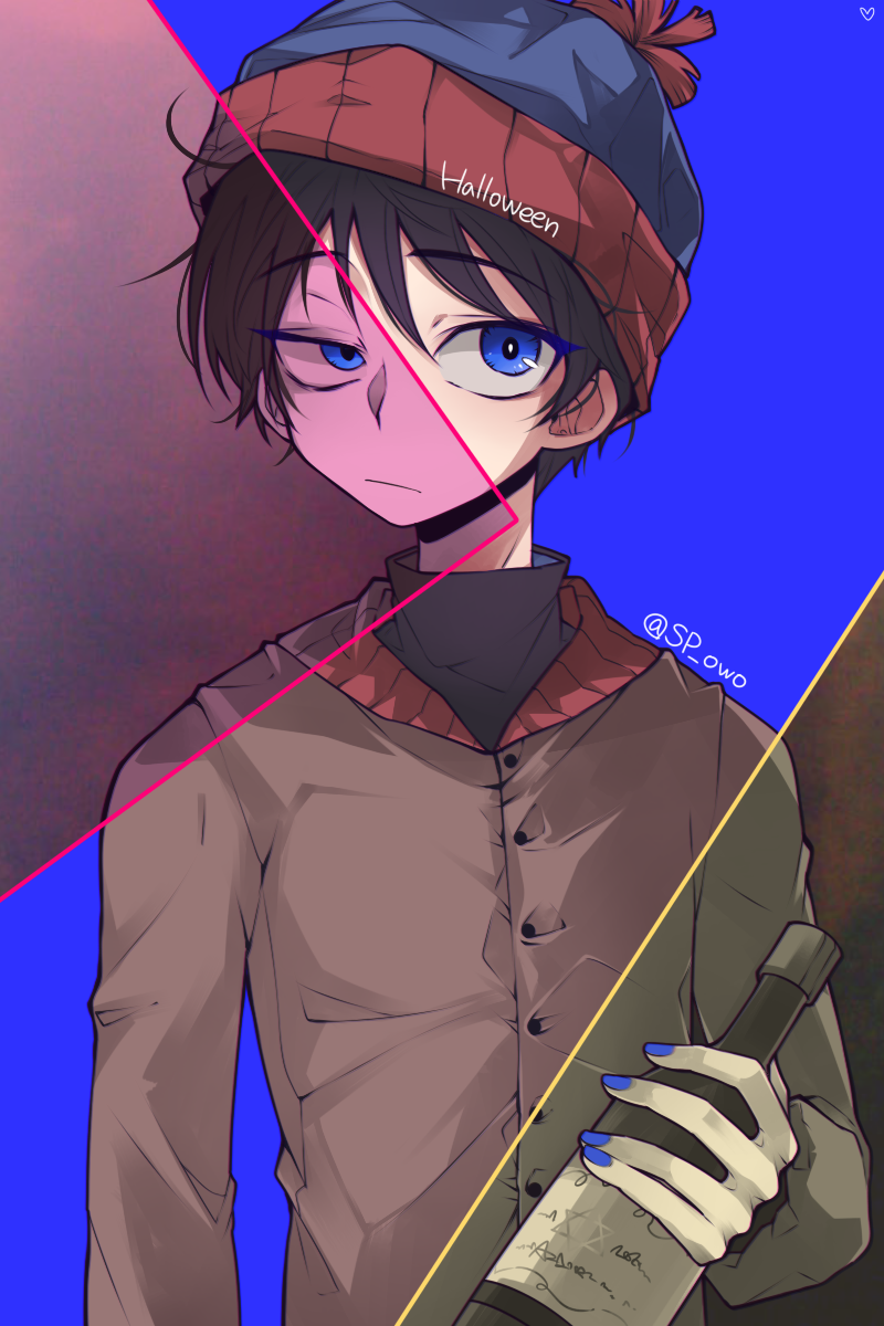 1boy beanie black_hair blue_background blue_eyes bottle frown half-closed_eyes halloween_(owo) hat highres holding holding_bottle jacket long_sleeves male_focus nail_polish pom_pom_(clothes) pom_pom_beanie short_hair solo south_park stan_marsh uneven_eyes