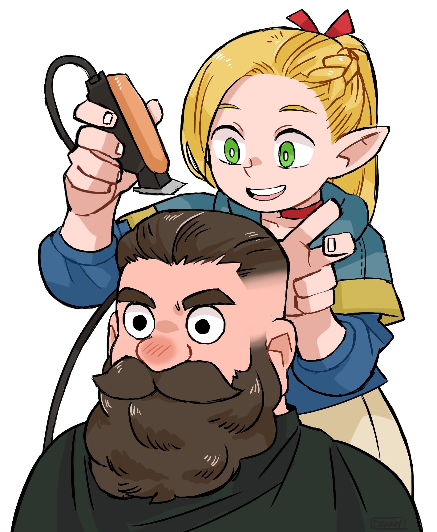 1boy 1girl alternate_facial_hair beard beard_over_mouth blank_stare blonde_hair braid brown_hair choso_giving_toudou_a_haircut_(meme) cutting_hair danny_but_spooky dungeon_meshi dwarf electric_razor elf facial_hair fade_(haircut) fake_horns green_eyes hair_slicked_back helmet highres holding horned_helmet horns long_beard long_hair long_sleeves marcille_donato meme mustache pointy_ears razor senshi_(dungeon_meshi) short_hair thick_mustache undercut