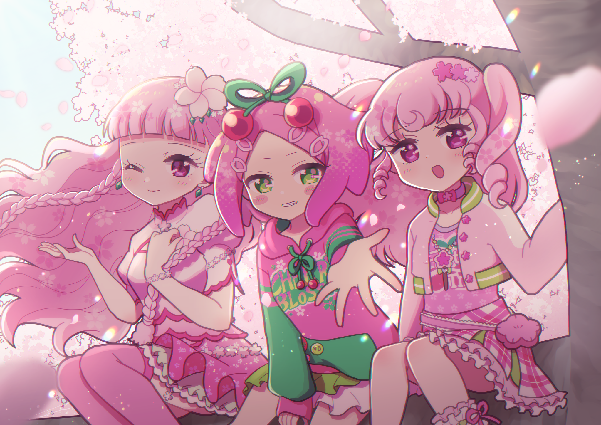 3girls :d alternate_color alternate_hair_color backlighting blue_sky blunt_bangs blush braid cherry_blossoms cherry_hair_ornament closed_mouth cropped_jacket dress falling_petals feet_out_of_frame flower food-themed_hair_ornament frilled_skirt frills green_eyes hair_flower hair_ornament hand_on_own_chest hands_up highres hood hoodie idol_clothes idol_time_pripara jacket koda_michiru koyoshi_yoko long_hair long_sleeves looking_at_viewer miichiru_(pripara) multiple_girls nijiiro_nino one_eye_closed open_hand open_mouth outdoors outstretched_arm petals pink_dress pink_eyes pink_flower pink_hair pink_hoodie pink_jacket pink_skirt pink_theme pink_thighhighs pretty_series pripara reaching reaching_towards_viewer ringlets short_hair sitting sitting_on_branch skirt sky smile thighhighs tree twin_braids two_side_up very_long_hair wavy_hair wind yumekawa_yui