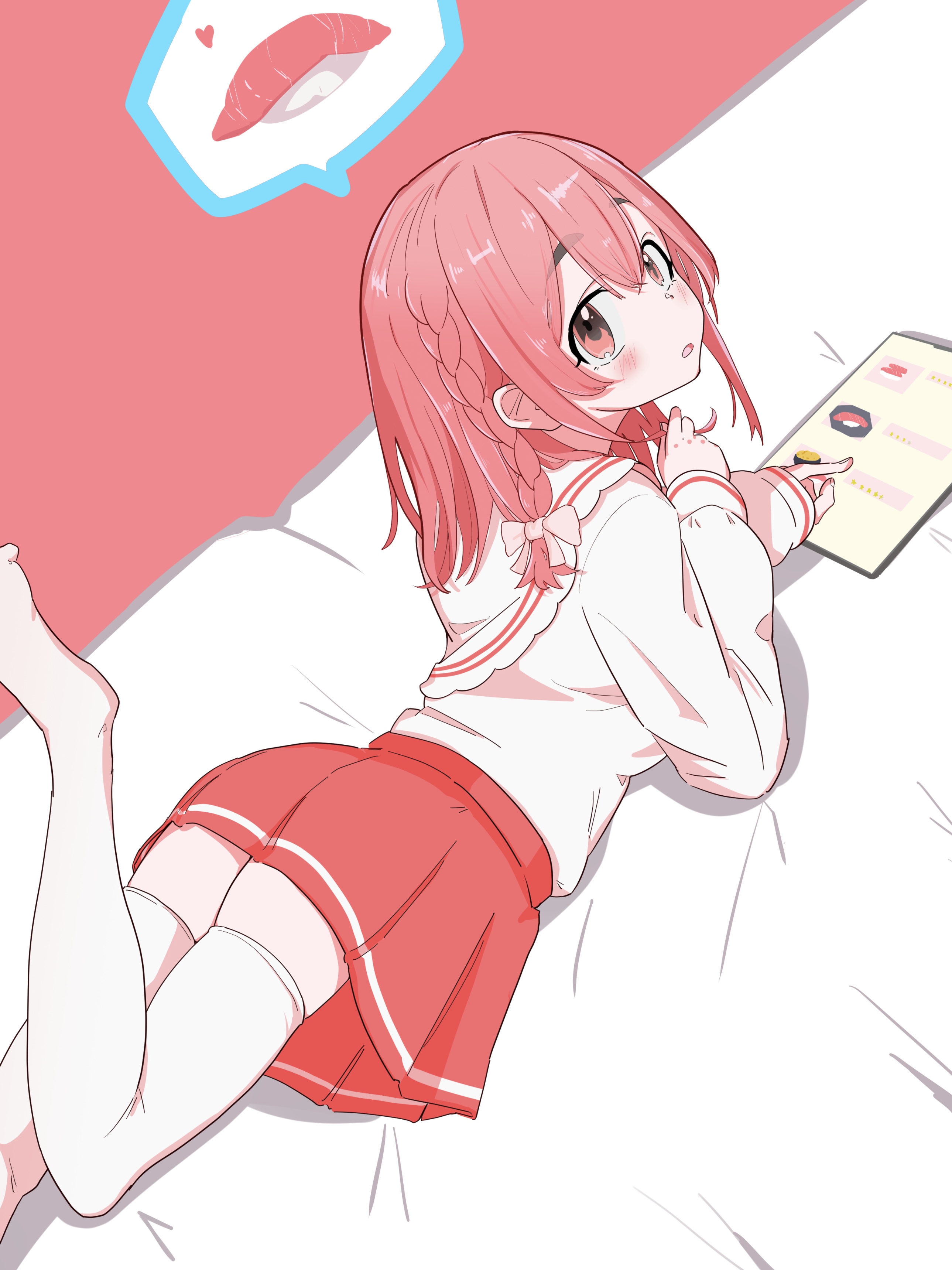 1girl absurdres blush bow dot_nose female_focus food hair_bow heart_(symbol) highres kanojo_okarishimasu long_hair long_sleeve_shirt looking_at_viewer lying menu open_mouth pink_eyes pink_hair pointing sakurasawa_sumi shimot13 skirt solo speech_bubble sushi thighhighs white_thighhighs