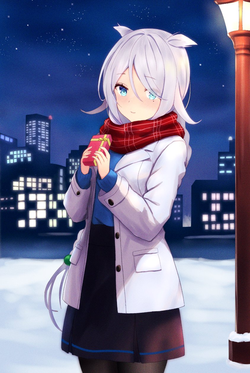 1girl black_dress black_pantyhose blush box braid closed_mouth coat cowboy_shot dress gift gift_box grey_hair highres holding holding_gift kantai_collection kotou_yogen long_hair long_sleeves mole mole_under_eye night open_clothes open_coat outdoors pantyhose purple_eyes red_scarf scarf single_braid smile solo umikaze_(kancolle) valentine white_coat