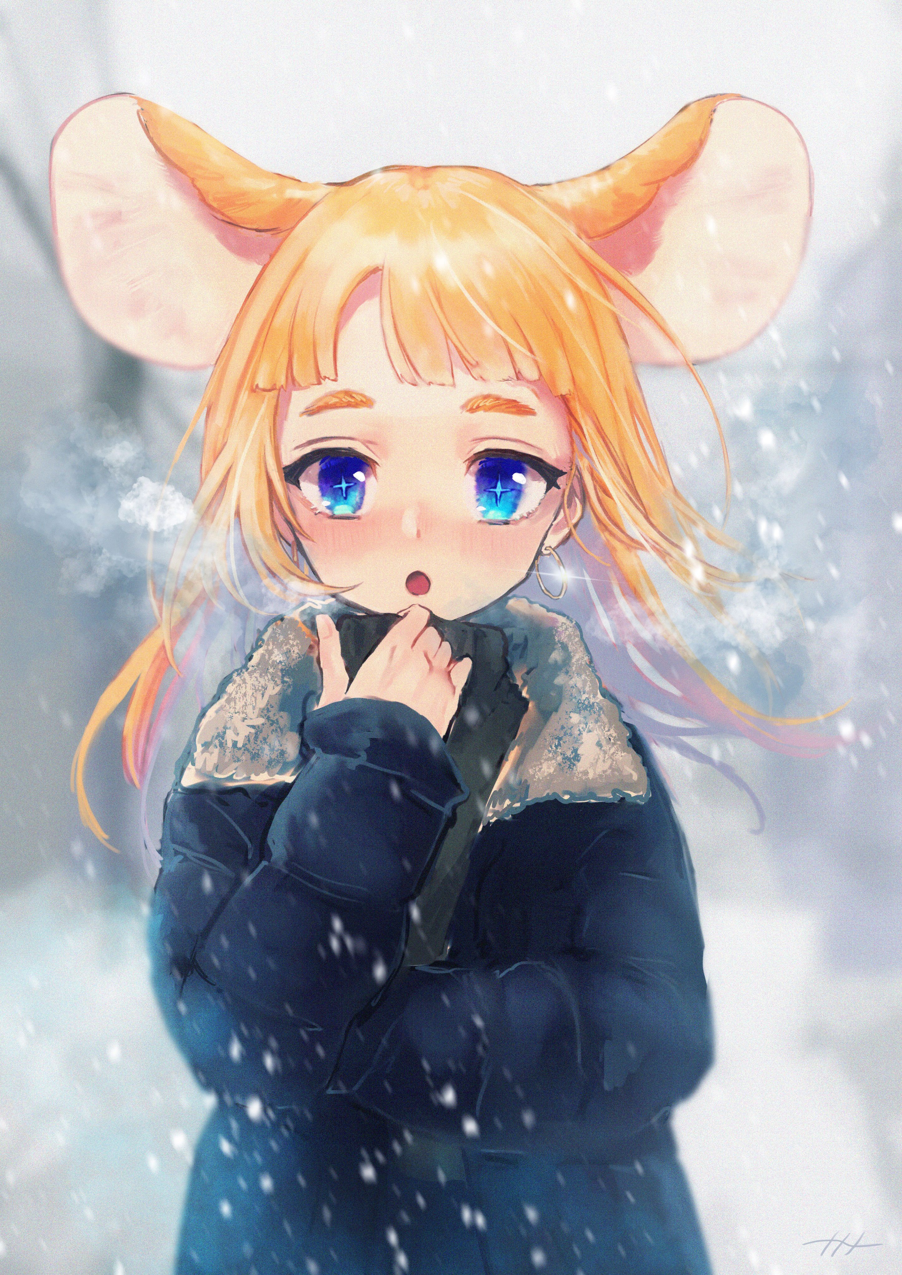 +_+ 1girl absurdres animal_ears blue_eyes blunt_bangs blush breath coat earrings high_collar highres hoop_earrings indie_virtual_youtuber jewelry long_hair long_sleeves looking_at_viewer mouse_ears mouse_girl naname_(7name) open_mouth orange_hair original outdoors snowing solo thick_eyebrows virtual_youtuber