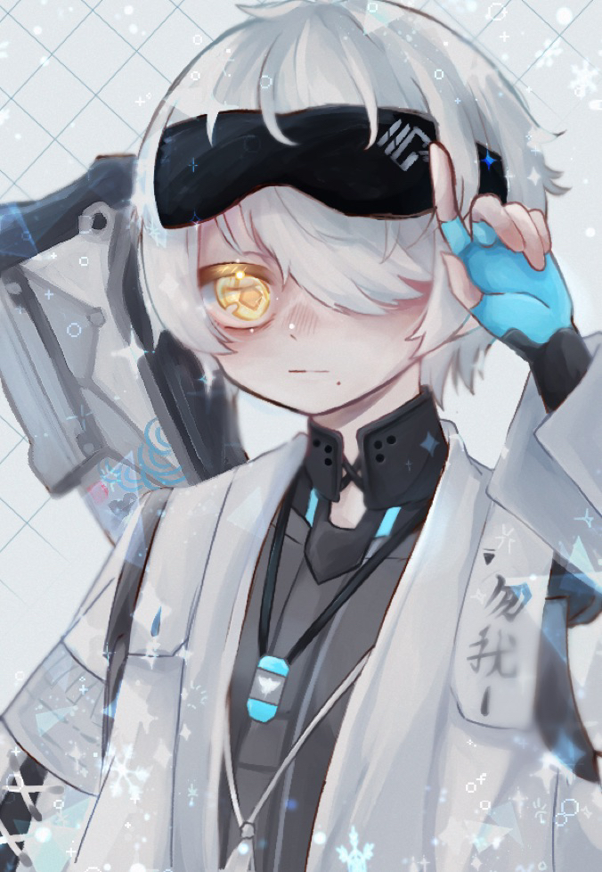 1boy bodysuit character_request dog_tags grey_bodysuit grey_hair grey_skirt hair_over_one_eye long_sleeves mechanical_arms misoso_25 punishing:_gray_raven skirt solo weapon weapon_on_back yellow_eyes