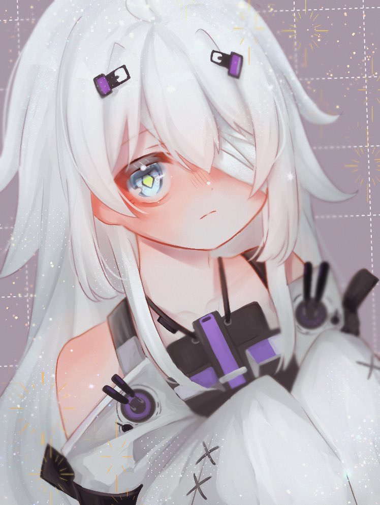1girl bandage_over_one_eye bare_shoulders chest_protector closed_mouth dress grey_dress grey_eyes grey_hair hair_between_eyes hair_ornament hairclip long_hair long_sleeves misoso_25 no._21:_xxi_(pgr) no._21_(pgr) punishing:_gray_raven sleeves_past_fingers sleeves_past_wrists solo suspenders