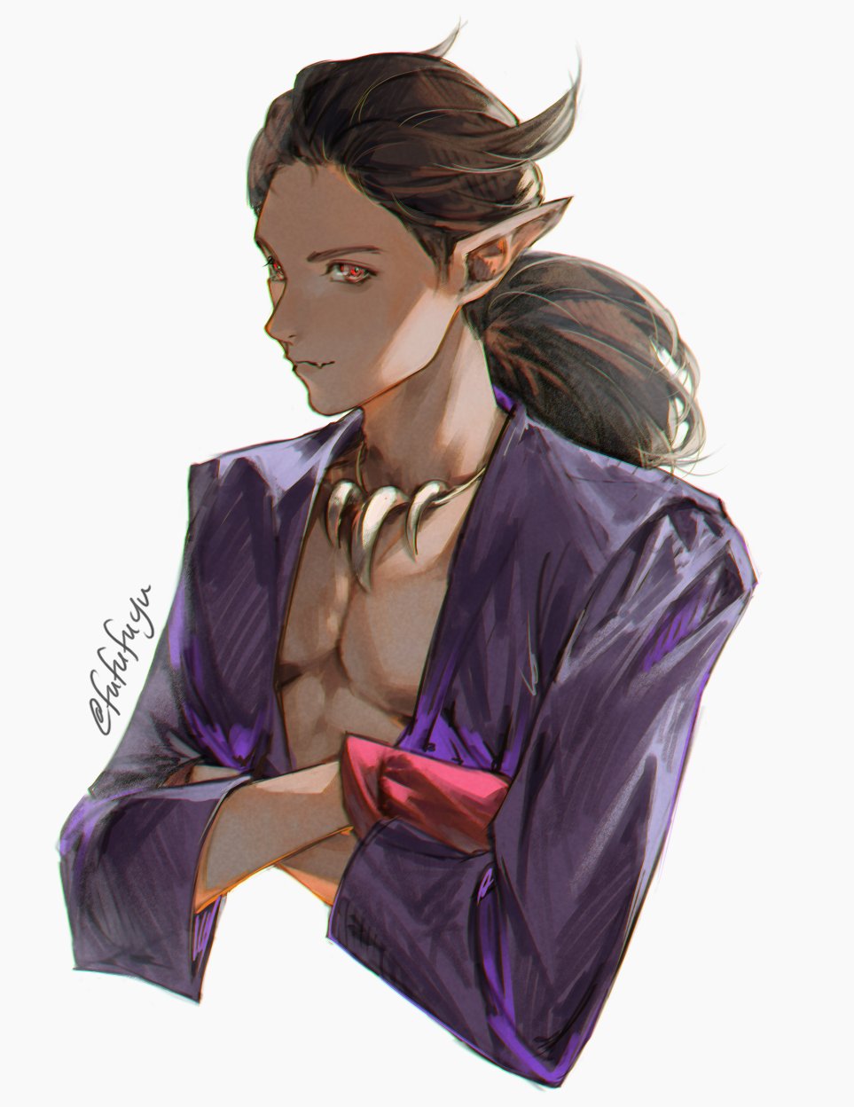 1boy brown_hair cropped_torso crossed_arms dotesper dragon_quest dragon_quest_builders_2 fang fang_out gloves grey_background hair_pulled_back highres jacket jewelry long_hair long_sleeves looking_at_viewer low_ponytail male_focus necklace orange_eyes pectorals pointy_ears ponytail portrait purple_jacket red_gloves sidoh_(dqb2) solo tan tooth_necklace twitter_username upper_body wide_ponytail
