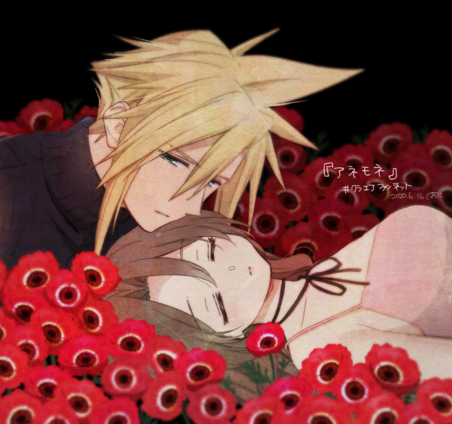 1boy 1girl aerith_gainsborough aqua_eyes artist_name bare_shoulders black_background blonde_hair blue_shirt breasts brown_hair choker closed_eyes cloud_strife commentary_request couple dated dress final_fantasy final_fantasy_vii final_fantasy_vii_remake flower hair_between_eyes half-closed_eyes hetero krudears long_hair lying medium_breasts on_back parted_bangs parted_lips pink_dress red_flower ribbon_choker shirt short_hair sidelocks sleeveless sleeveless_dress spiked_hair sweater turtleneck turtleneck_sweater upper_body wavy_hair