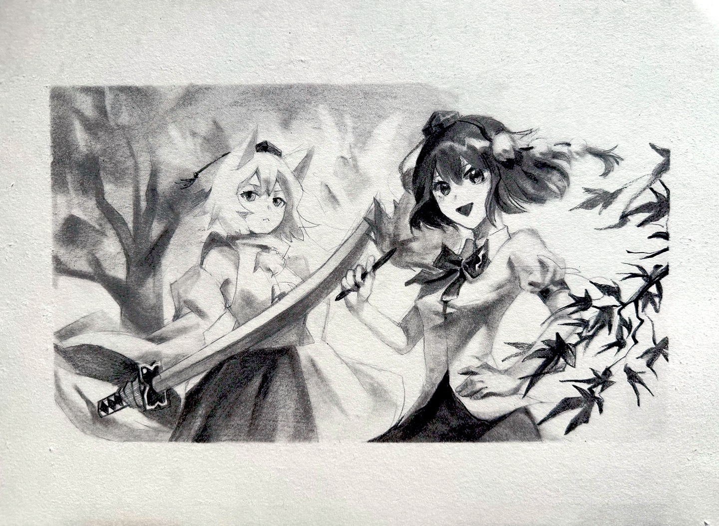 2girls animal_ears breasts charcoal_(medium) chinese_commentary commentary_request detached_sleeves greyscale hand_on_own_hip hat holding holding_sword holding_weapon inubashiri_momiji monochrome multiple_girls neck_ribbon open_mouth outdoors pom_pom_(clothes) puffy_short_sleeves puffy_sleeves ribbon shameimaru_aya shirt short_sleeves simple_background skirt sleeveless sleeveless_shirt small_breasts smile sword tokin_hat touhou traditional_media weapon white_background wolf_ears wolf_girl xinbuqing