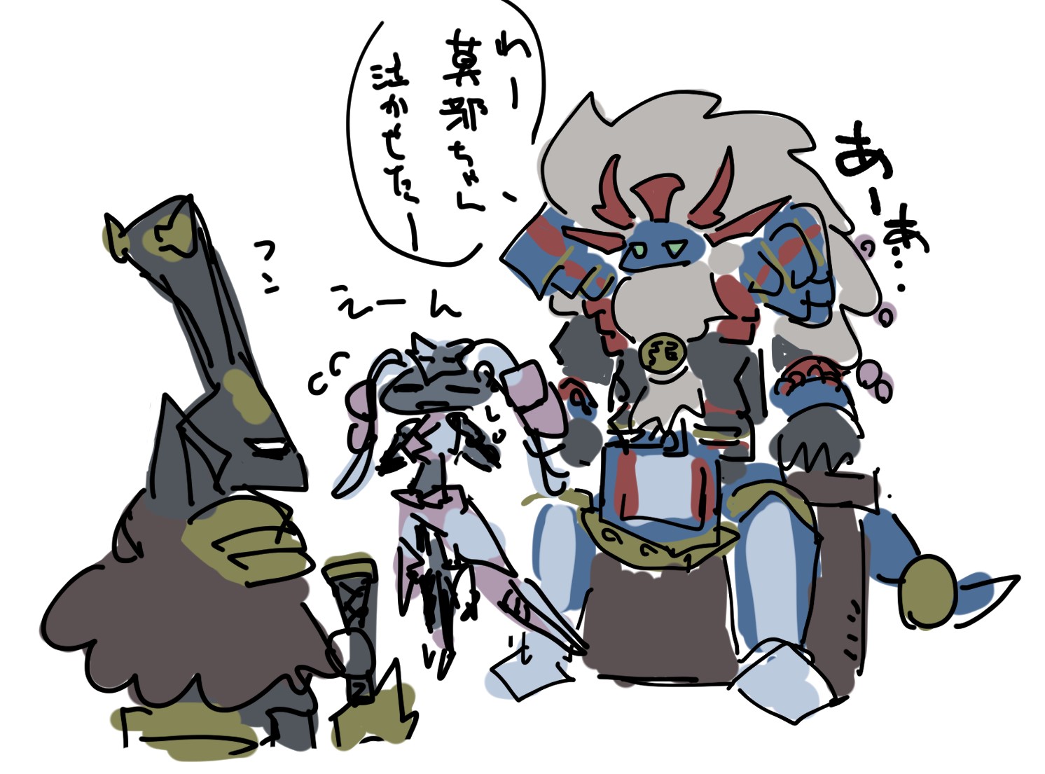 1girl 2boys armor artist_name artist_request bodysuit doodle dragon dragon_girl dragon_tail flying_sweatdrops japanese_text long_hair multiple_boys simple_background sitting sketch swordsoul_(yu-gi-oh!) swordsoul_of_mo_ye swordsoul_strategist_longyuan swordsoul_supreme_sovereign_-_chengying tail translation_request white_background worried yu-gi-oh!