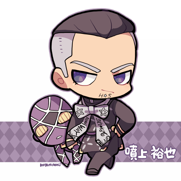 1boy black_hair black_jacket black_pants bow bowtie chibi chibi_only closed_mouth diamond_wa_kudakenai eyelashes facial_tattoo full_body fungami_yuya grey_bow hand_on_own_hip highway_star_(stand) jacket jojo_no_kimyou_na_bouken kotomaru_(kotokoto_kottan) looking_at_viewer male_focus no_nose pants purple_eyes short_hair signature solo stand_(jojo) tattoo translation_request undercut