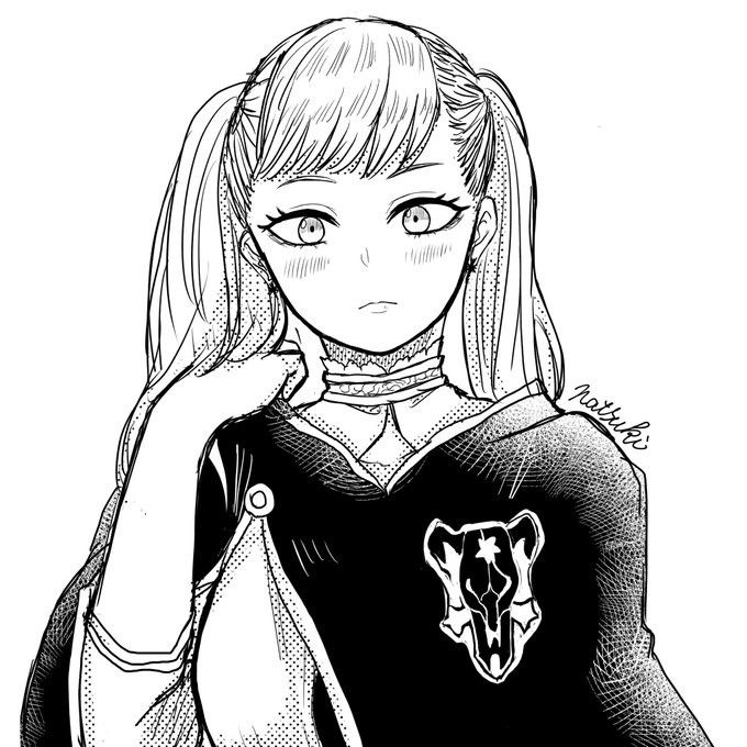 1girl black_bulls_(emblem) black_clover blush monochrome noelle_silva rope simple_background sketch twintails white_background