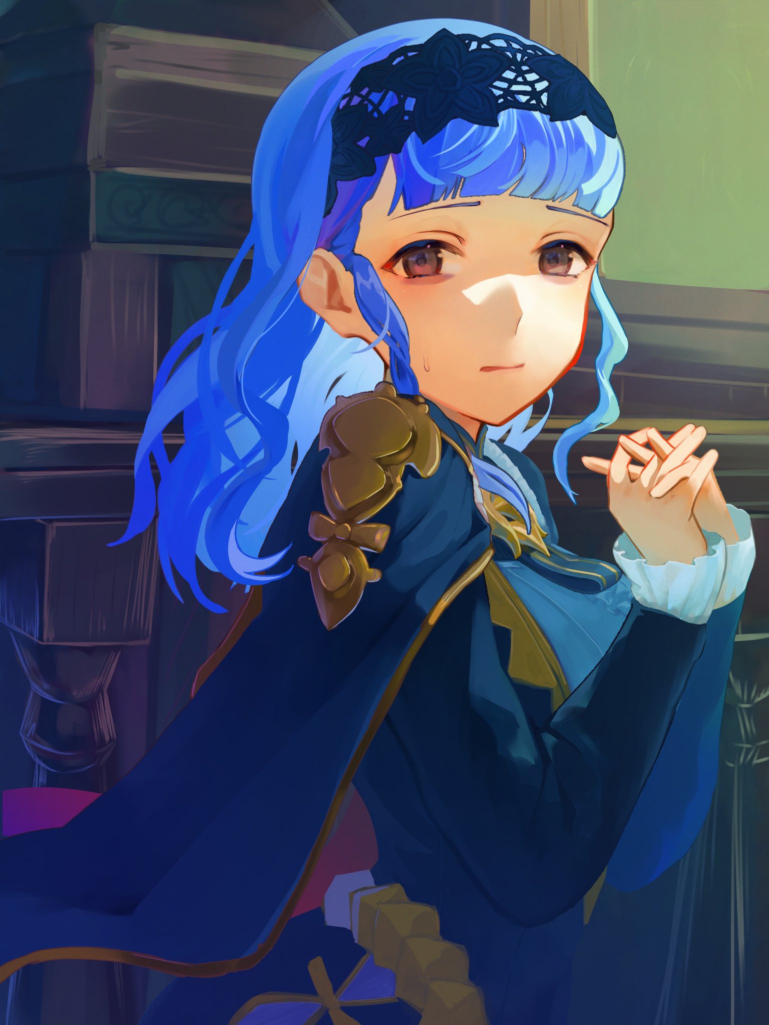 1girl aoisu_ao blue_capelet blue_hair brown_eyes capelet closed_mouth commentary_request fire_emblem fire_emblem:_three_houses fire_emblem_warriors:_three_hopes gold_trim highres indoors long_hair looking_at_viewer marianne_von_edmund nintendo official_alternate_costume official_alternate_hairstyle own_hands_together solo upper_body window