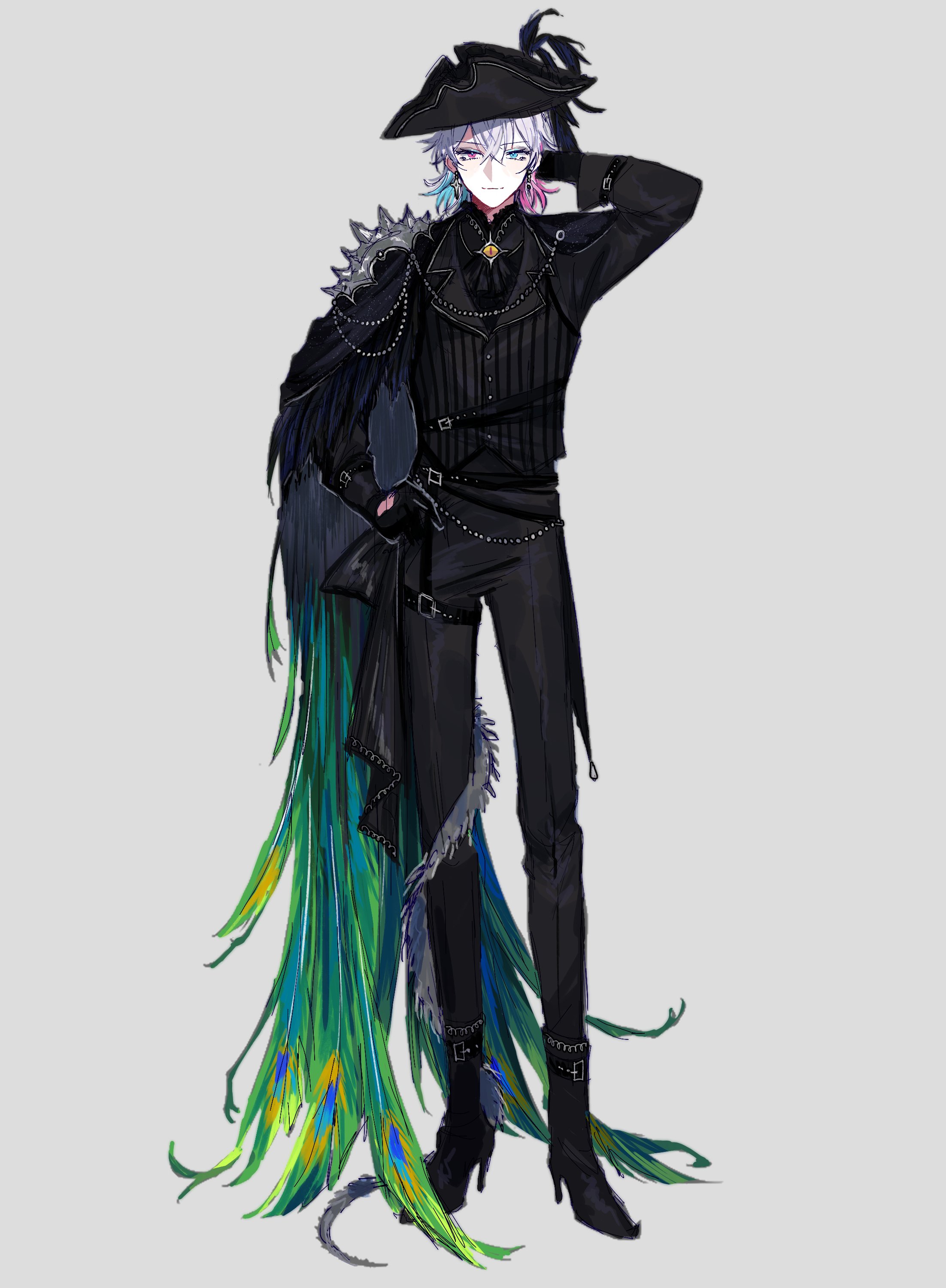 1boy absurdres alternate_costume ascot belt bicorne black_ascot black_belt black_boots black_gloves black_hat black_pants blue_eyes blue_hair boots commentary earrings english_commentary eyeshadow facing_viewer full_body gavis_bettel gloves goth_fashion grey_background grey_hair hair_between_eyes hand_on_own_hip hat heterochromia high_heel_boots high_heels highres holostars holostars_english jewelry looking_at_viewer makeup male_focus multicolored_hair nonsensemanna pants peacock_feathers petticoat pink_eyes pink_eyeshadow pink_hair solo standing tail tail_wrap virtual_youtuber
