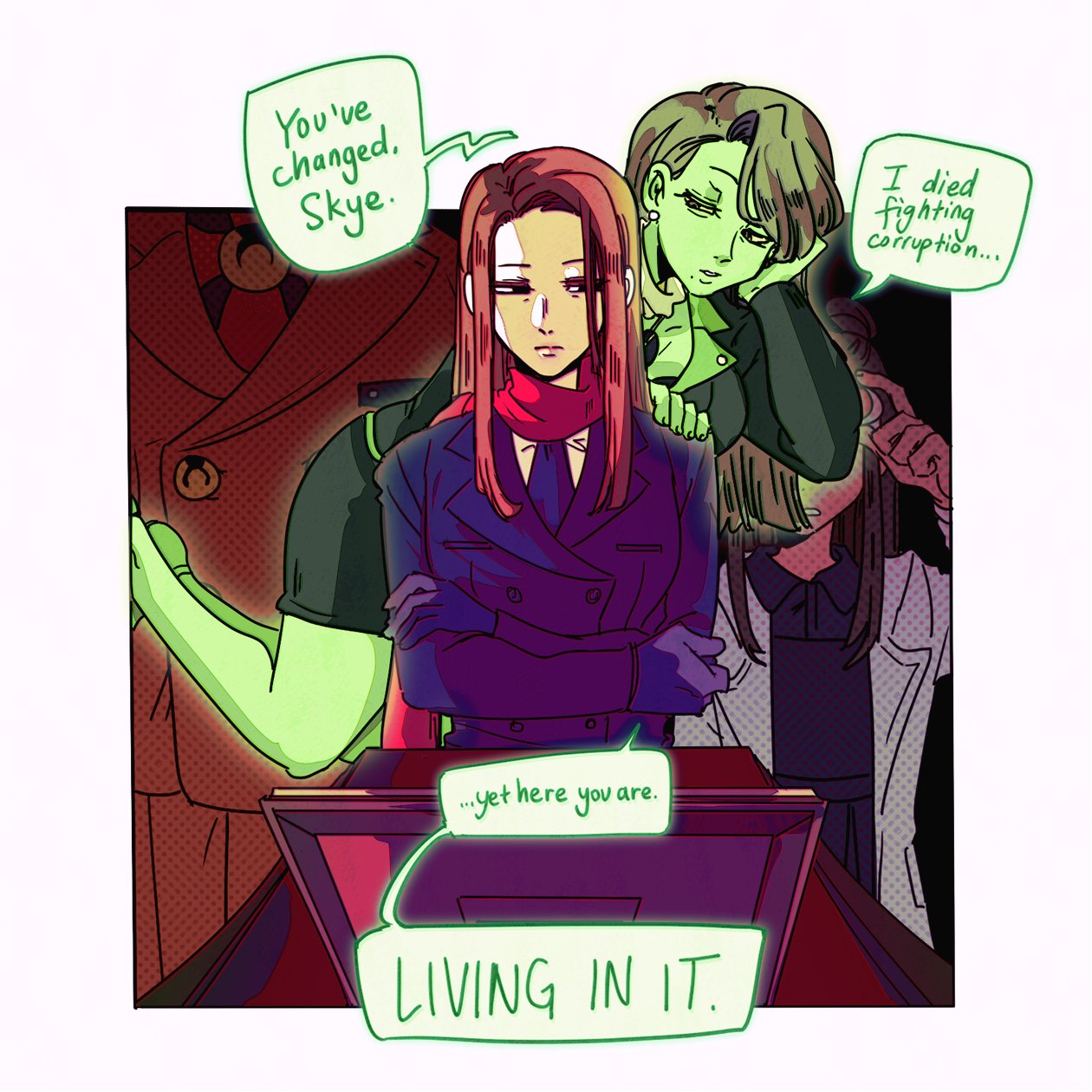1boy 3girls ace_attorney black_background black_eyes black_jacket black_skirt blue_jacket border brown_hair coat colored_skin commentary crossed_arms damon_gant earrings ema_skye empty_eyes english_commentary english_text expressionless eyewear_on_head ghost ghost_girl gloves green_skin hand_on_another's_shoulder head_out_of_frame head_rest highres jacket jewelry lab_coat lana_skye light_brown_hair looking_to_the_side magatama magatama_necklace mia_fey ministarfruit mole mole_under_mouth multiple_girls necklace necktie orange_jacket orange_pants pants pencil_skirt phoenix_wright:_ace_attorney pink-framed_eyewear red_necktie red_scarf scarf school_uniform shirt sidelocks skirt speech_bubble topknot white_border white_coat white_shirt