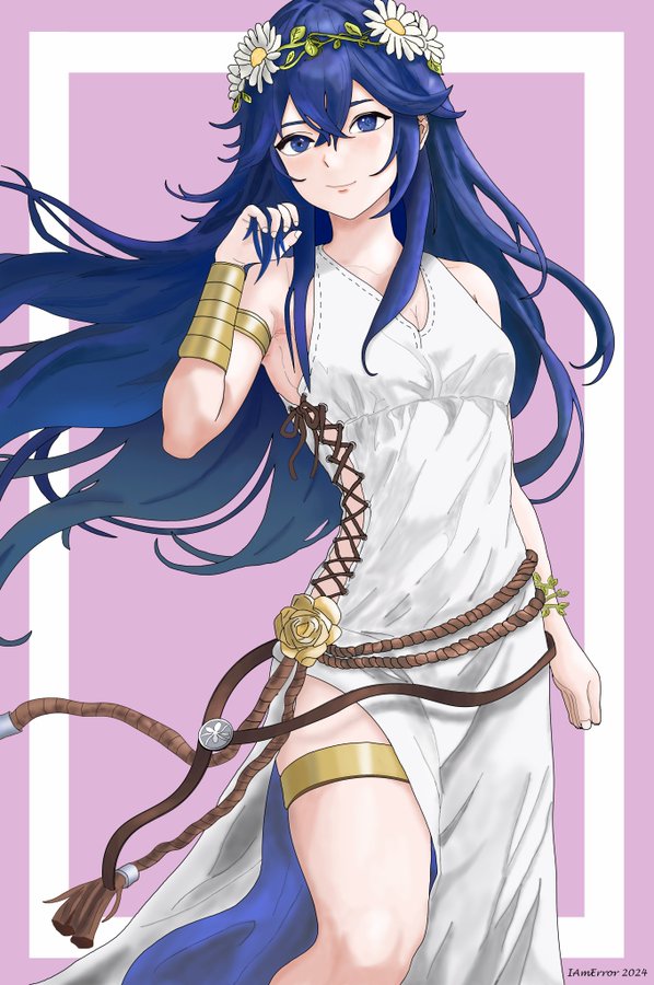 1girl alternate_costume armlet blue_eyes blue_hair dress fire_emblem fire_emblem_awakening fire_emblem_heroes flower flower_on_head iamerror jewelry lucina_(fire_emblem) lucina_(valentine)_(fire_emblem) nintendo official_alternate_costume side_slit white_dress