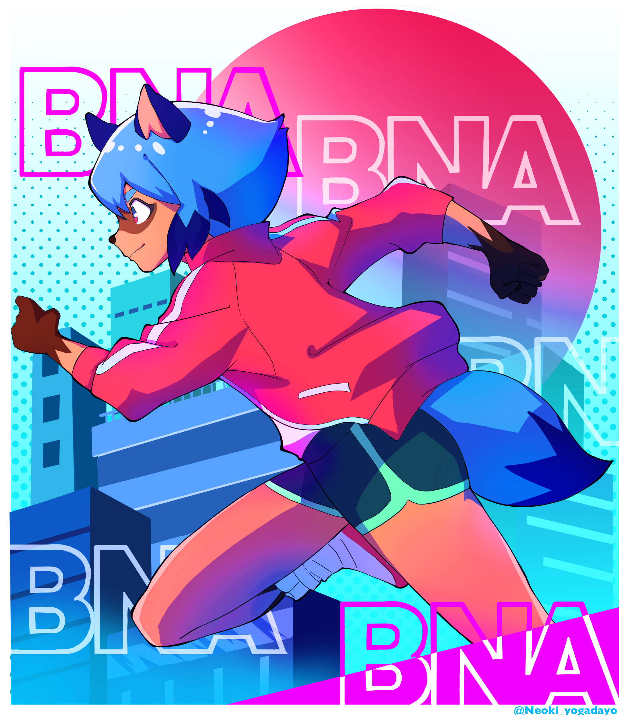 1girl animal_ears animal_nose blue_hair body_fur brand_new_animal brown_fur building dolphin_shorts furry furry_female highres jacket kagemori_michiru logo nk422704 outdoors raccoon_ears raccoon_girl animal_nose raccoon_tail red_jacket running shoes short_hair shorts sneakers solo tail tanuki track_jacket trigger_(company)