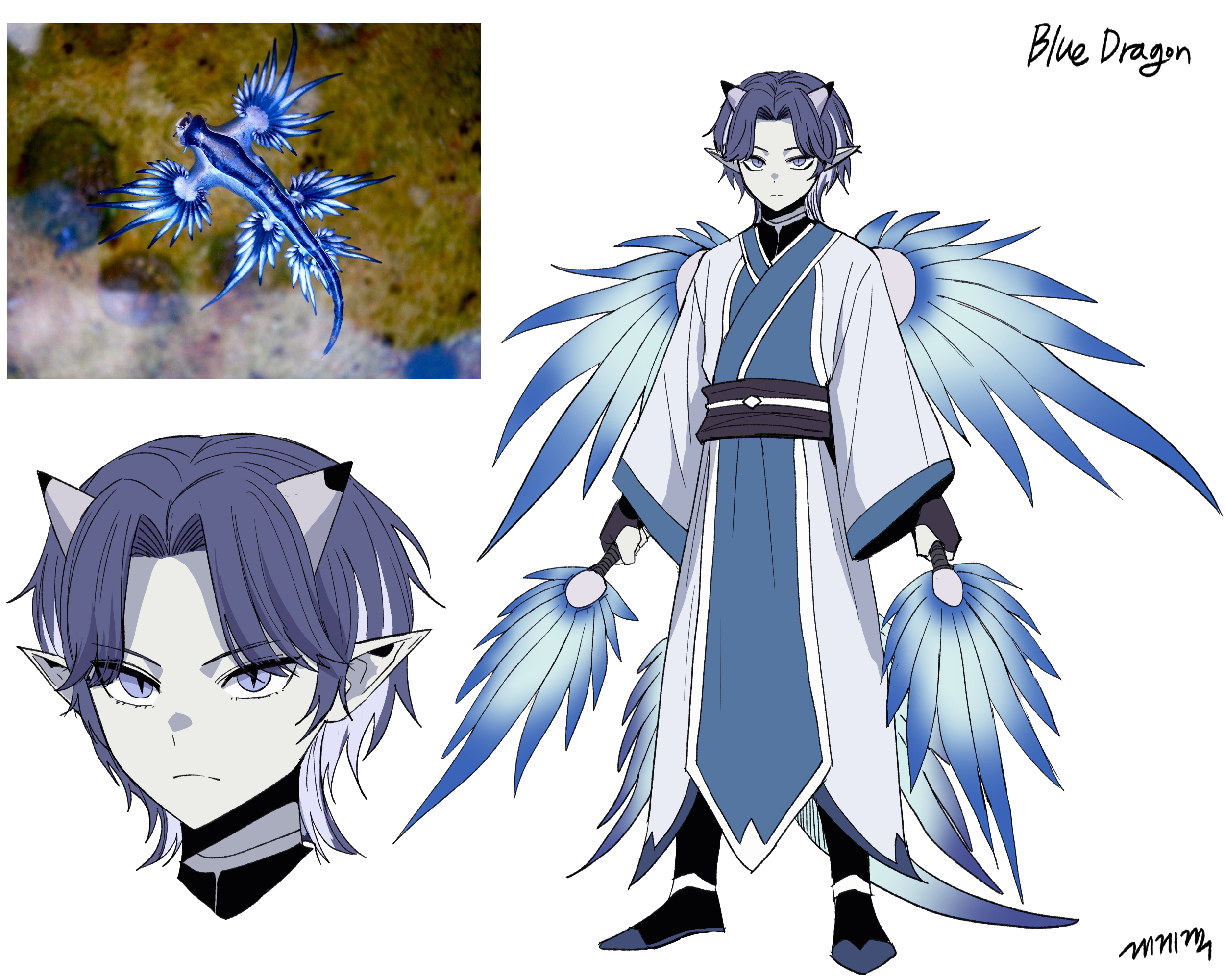 1boy black_footwear blue_eyes blue_hair closed_mouth colored_skin creature_and_personification full_body gegegekman glaucus_atlanticus hand_fan highres holding holding_fan horns looking_at_viewer male_focus multicolored_hair multiple_views original parted_bangs personification photo_inset pointy_ears reference_inset robe sash sea_slug signature slit_pupils tail two-tone_hair white_background white_hair white_skin wide_sleeves wings