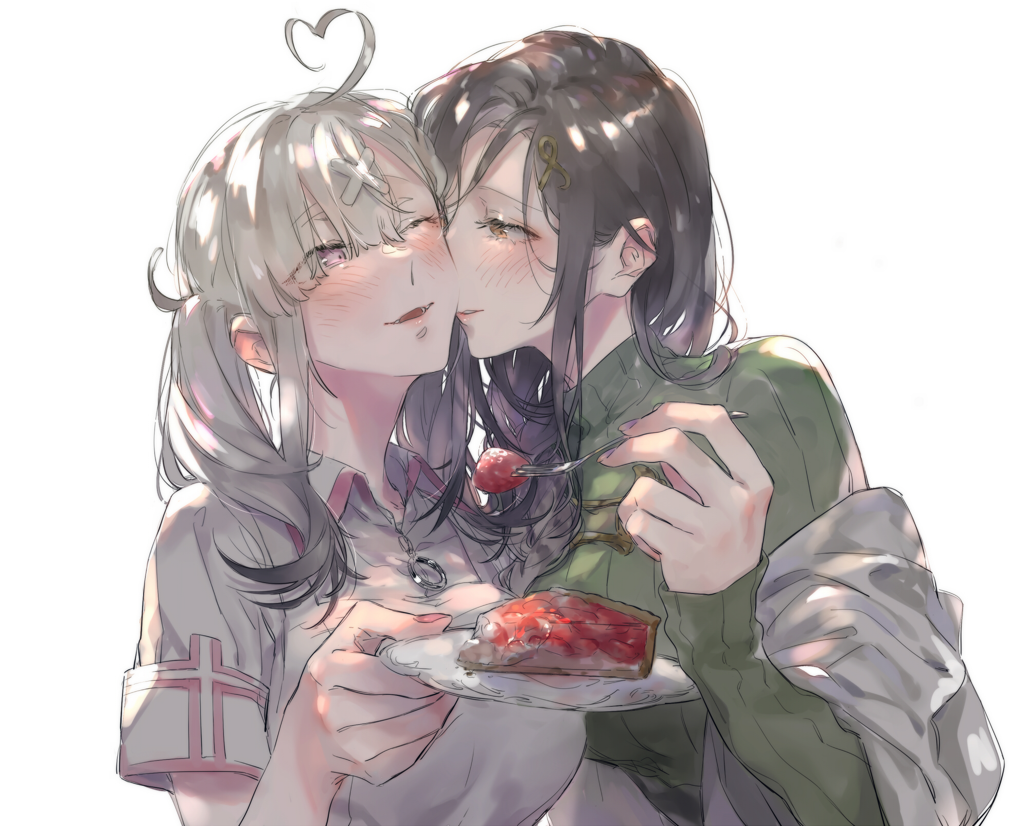 2girls backlighting black_hair blush brown_eyes cake collared_shirt dated food fork fruit green_sweater hair_ornament happy_birthday highres holding holding_fork holding_plate imminent_kiss kiss kissing_cheek long_sleeves looking_at_another multiple_girls nijisanji one_eye_closed parted_lips pink_eyes pink_nails plate shirayuki_tomoe shirt shuu-0208 sleeves_past_wrists strawberry sukoya_kana sweater turtleneck turtleneck_sweater twintails upper_body virtual_youtuber white_background white_hair white_shirt x_hair_ornament yuri