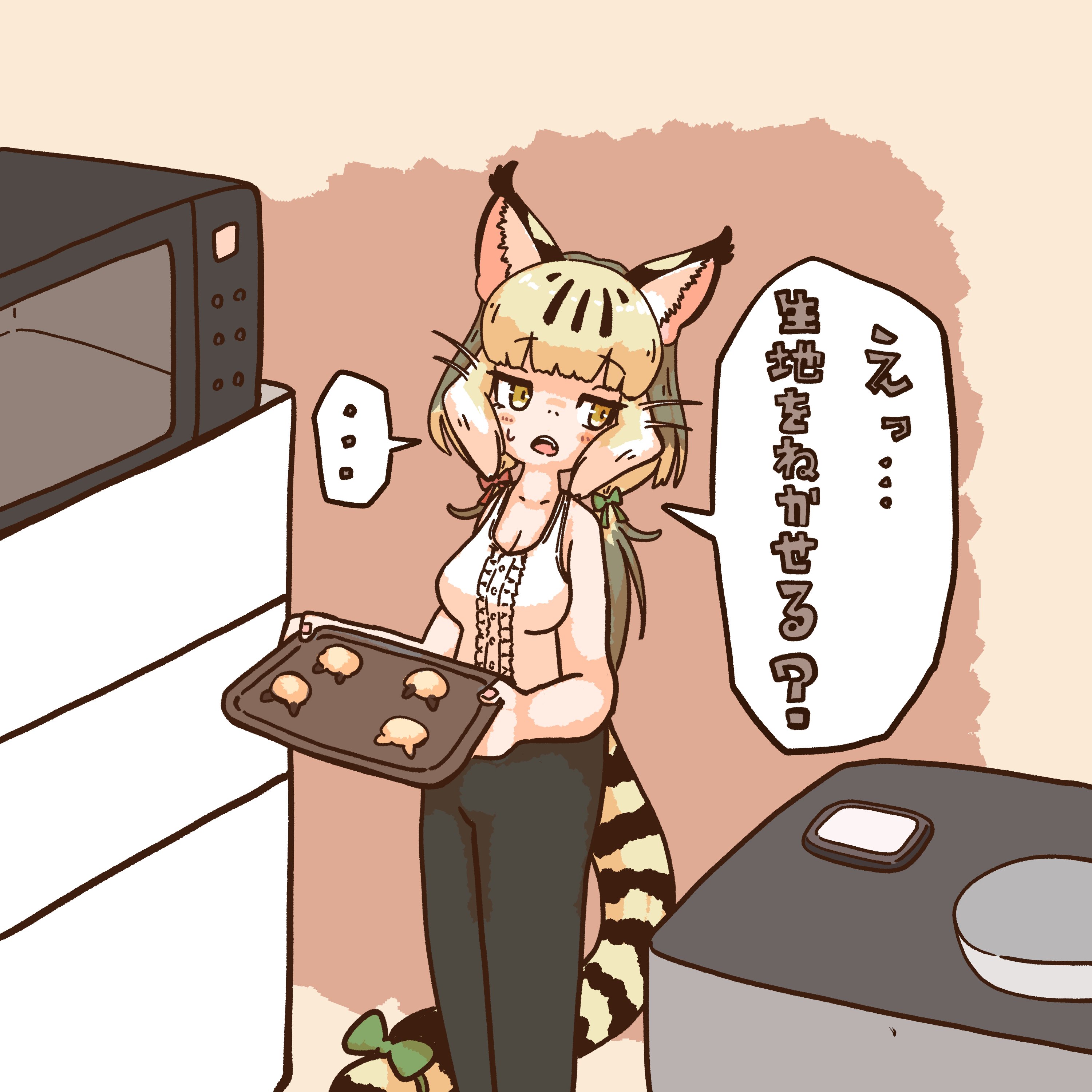 1girl absurdres animal_ears cat_ears cat_girl cat_tail cookie enokeyaki extra_ears food grey_eyes grey_hair highres jungle_cat_(kemono_friends) kemono_friends kemono_friends_v_project kitchen long_hair looking_at_viewer pants ribbon shirt simple_background sleeveless sleeveless_shirt solo tail translation_request twintails virtual_youtuber