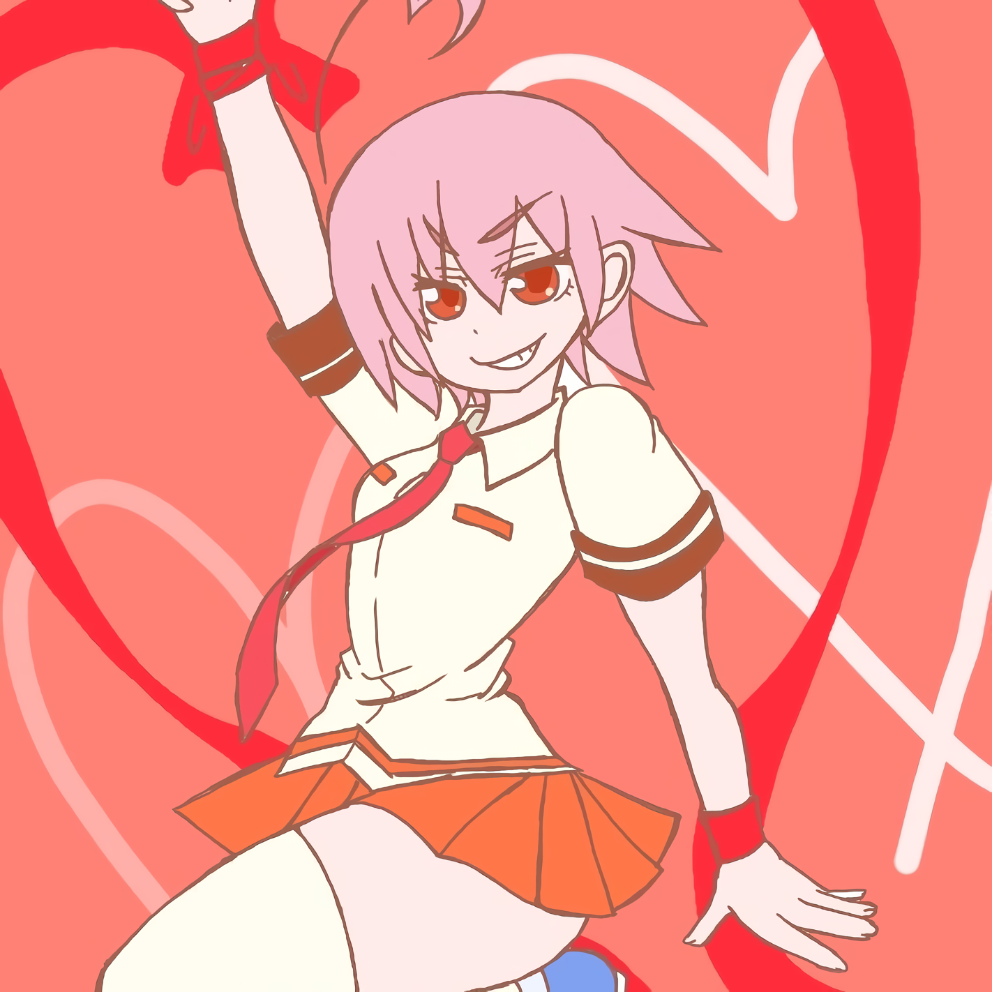 1girl aino_heart arcana_heart arm_support breasts grin heart highres legs necktie pink_hair red_eyes school_uniform short_hair skirt small_breasts smile smug solo thick_thighs thighs traditional_media