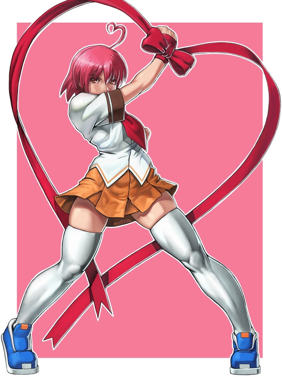 1girl ahoge aino_heart arcana_heart arm_up breasts brown_eyes clenched_hand heart heart_ahoge highres looking_at_viewer necktie pink_hair ribbon school_uniform short_hair small_breasts solo thick_thighs thighs toned