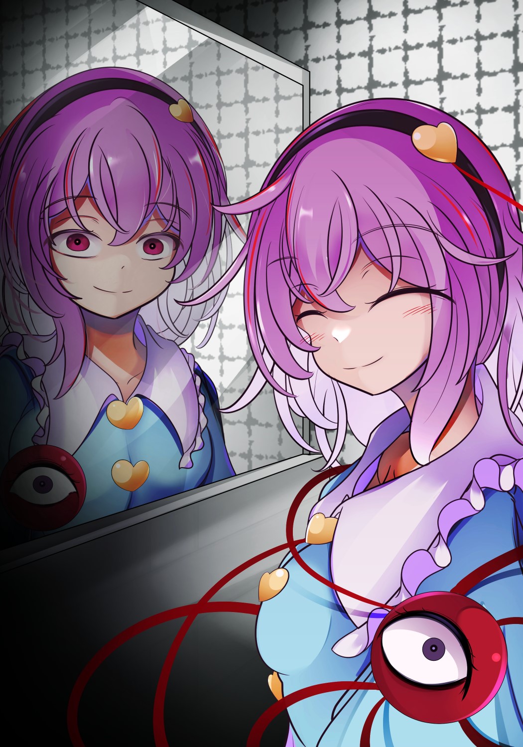 1girl black_hairband blue_shirt buttons closed_eyes closed_mouth commentary_request different_reflection eyeball false_smile frilled_shirt_collar frills hair_ornament hairband heart heart_button heart_hair_ornament highres kana_(user_rkuc4823) komeiji_satori looking_at_viewer medium_hair mirror pink_hair red_eyes reflection shirt smile solo third_eye touhou