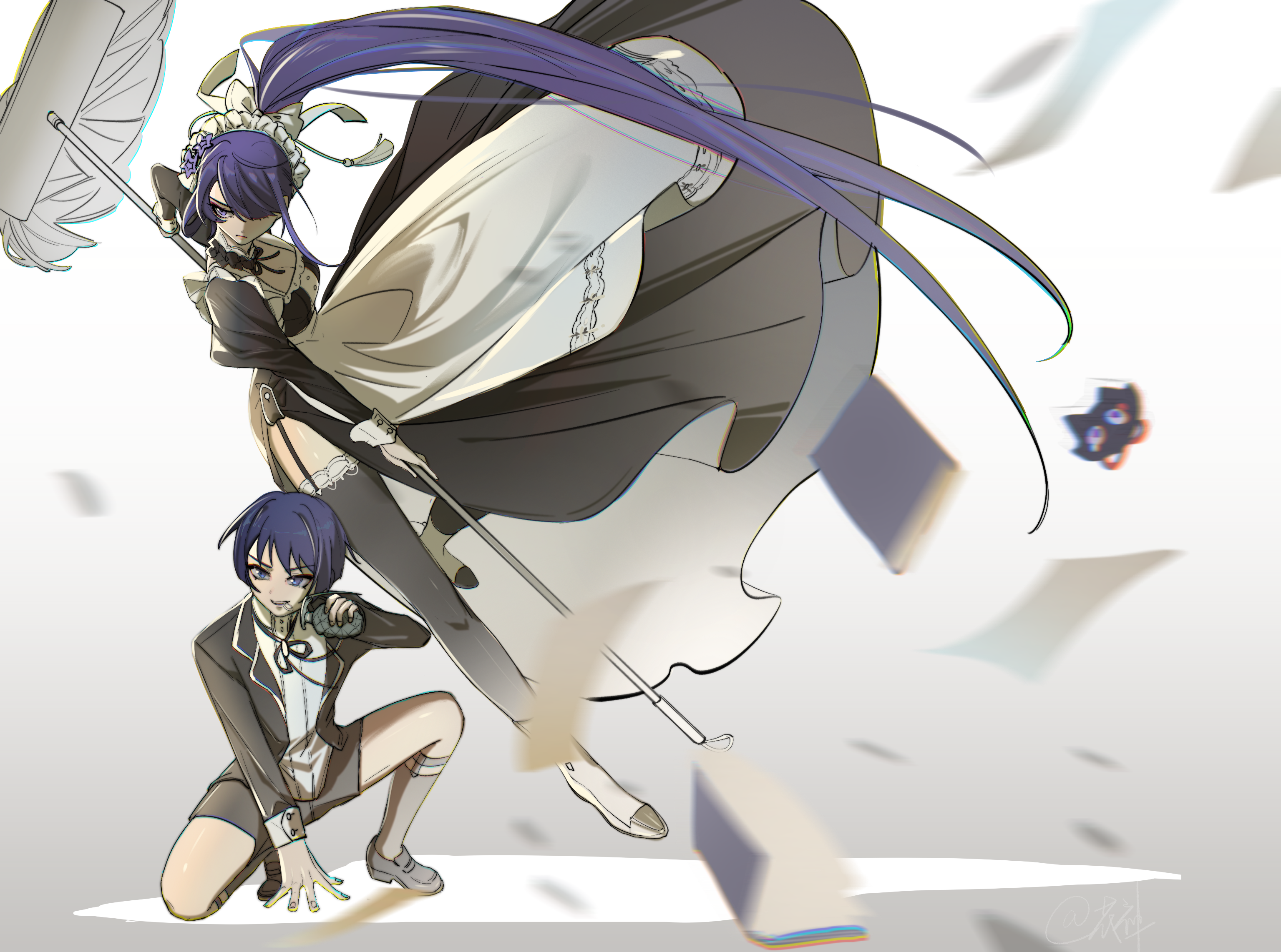 1girl blue_eyes blue_hair blunt_bangs bomb broom explosive formal_clothes genshin_impact grey_background hair_between_eyes hair_flowing_over hair_over_one_eye highres holding holding_broom holding_weapon long_hair long_sleeves maid maid_headdress mother_and_child mother_and_son nihaowojiaoshanghetu on_one_knee parent_and_child ponytail purple_eyes purple_hair raiden_shogun scaramouche_(genshin_impact) shorts simple_background suit thighs wanderer_(genshin_impact) weapon